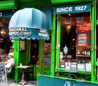 around the block from Caffe Reggio. In the movie, Serpico is taking Spanish Class at New York University, and one of his classmates, a girl says that she works at CAFFE REGGIO …