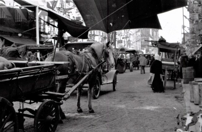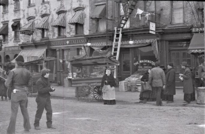 This photo was taken on East 6th Street in 1971. I’m sure you’re thinking that it looks much older than that. But in reality this is a 1970s photo of East 6th Street all dolled up to look much older – for the filming of the Godfather II! Pretty cool, right? The Oscar-winning sequel used East 6th Street to depict Vito Corleone’s Italian neighborhood of 1917, where he first started his family and his life of crime. I even found a couple stills from the movie where you can clearly make out the buildings and storefronts on the block – here you can see the double arched windows of the S. Fiore storefront at the far left of our photo, and here you can see that beautiful painted glass storefront bearing the name “The Washington.”